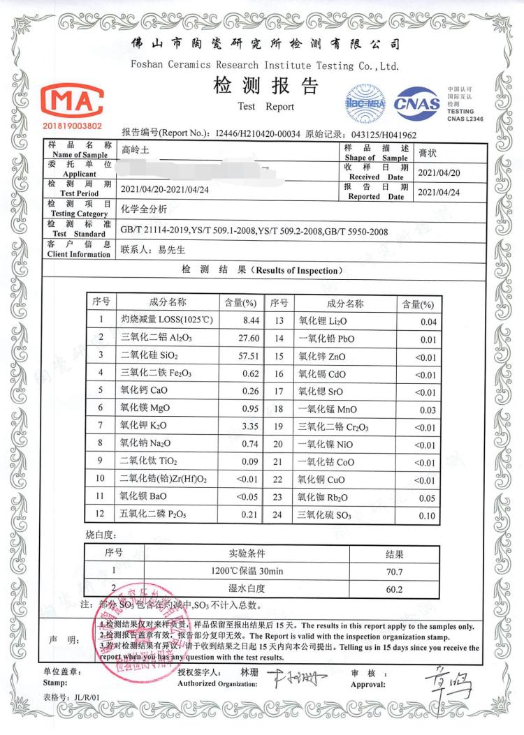 湖南产高强度高岭土,具体化学指标如下图所示: