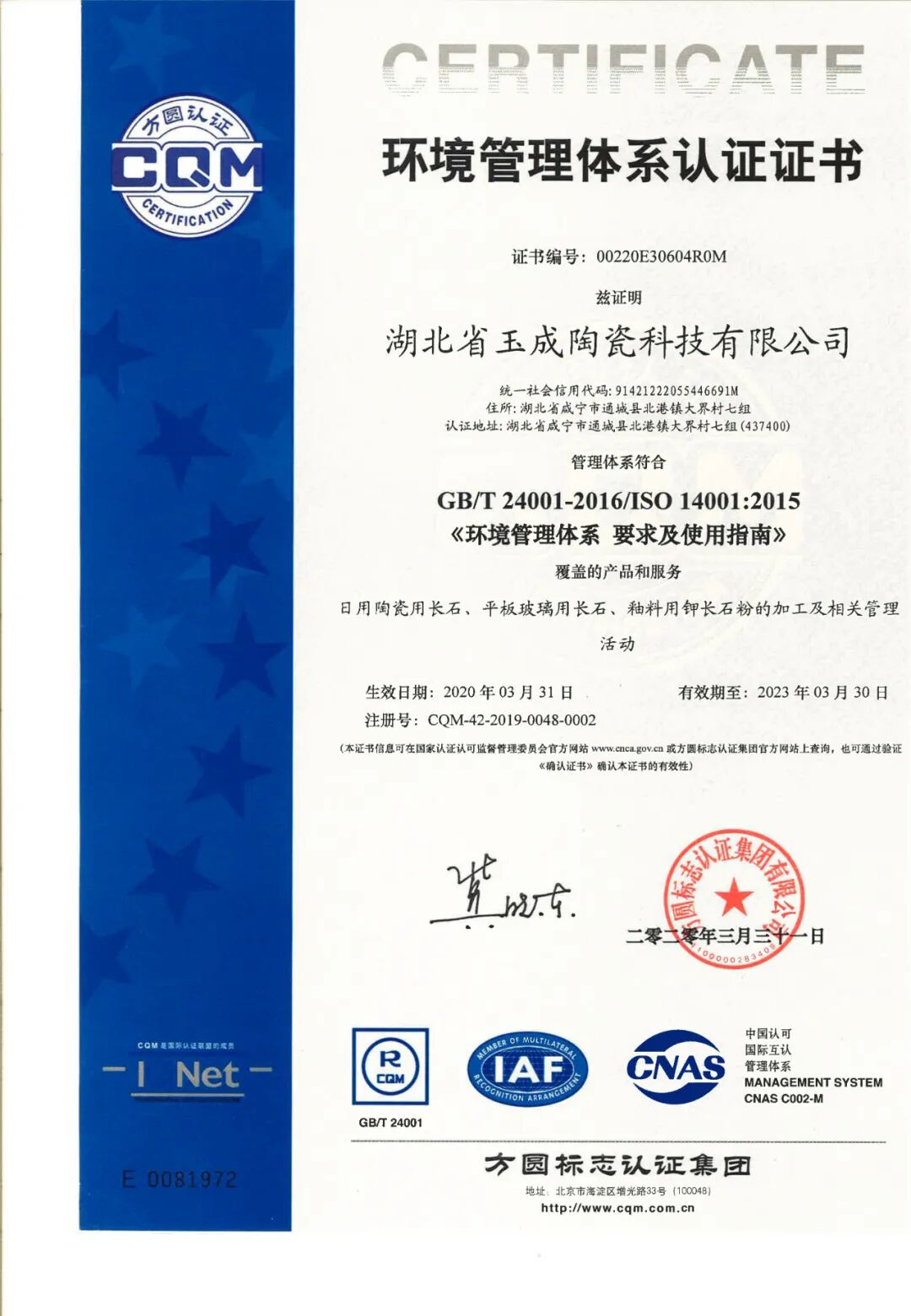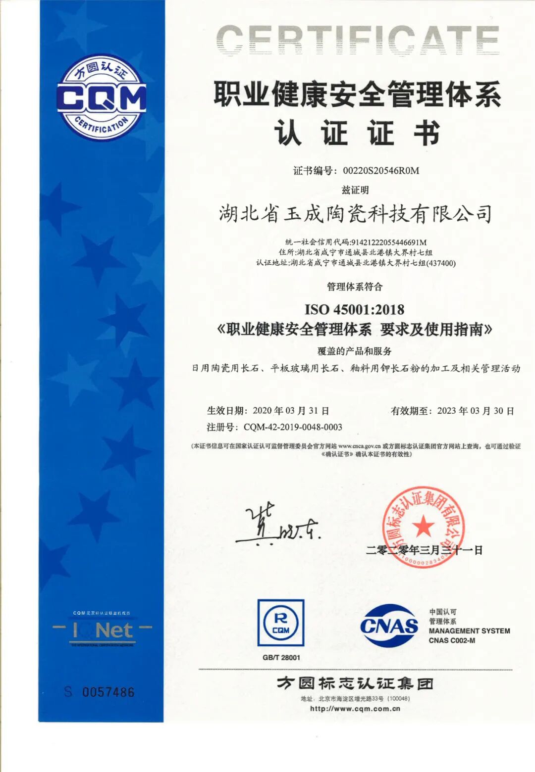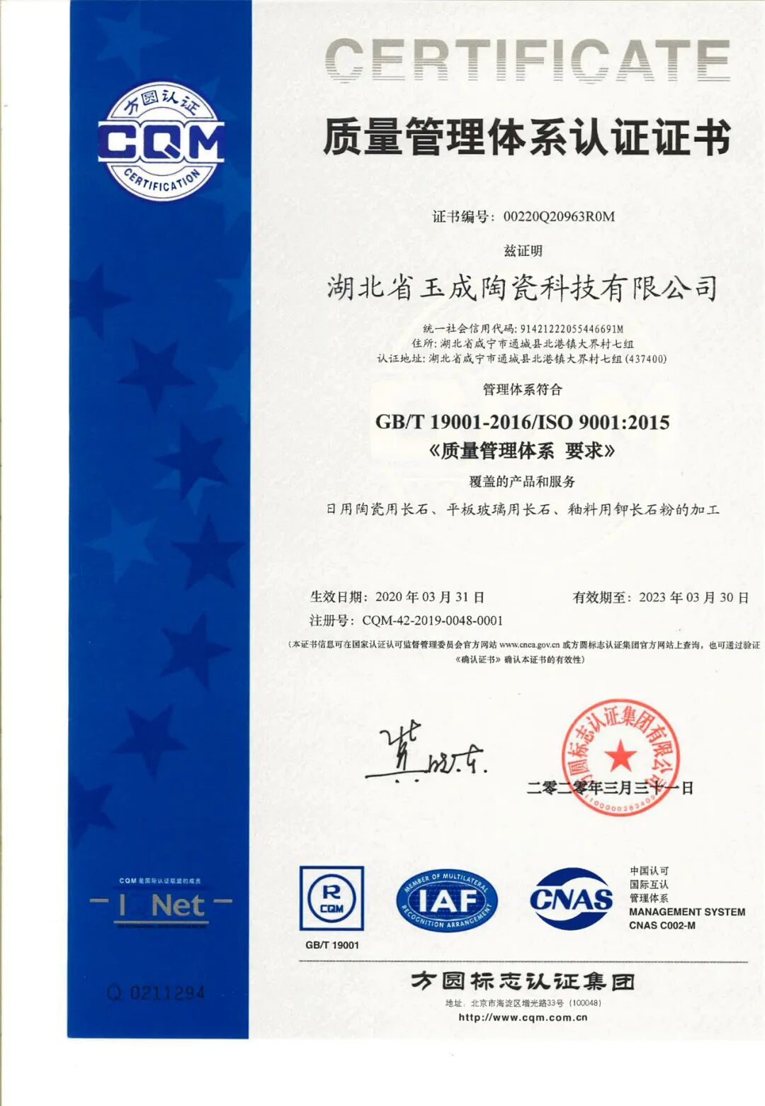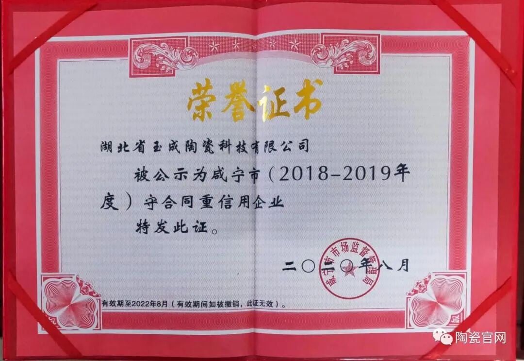 长期以来,以“守信用、重合同”作为企业立足的根本,以持续不断地研究只为研制出更好的产品理念为支撑,湖北玉成陶瓷有限公司在2020年斩获两项荣誉资质: