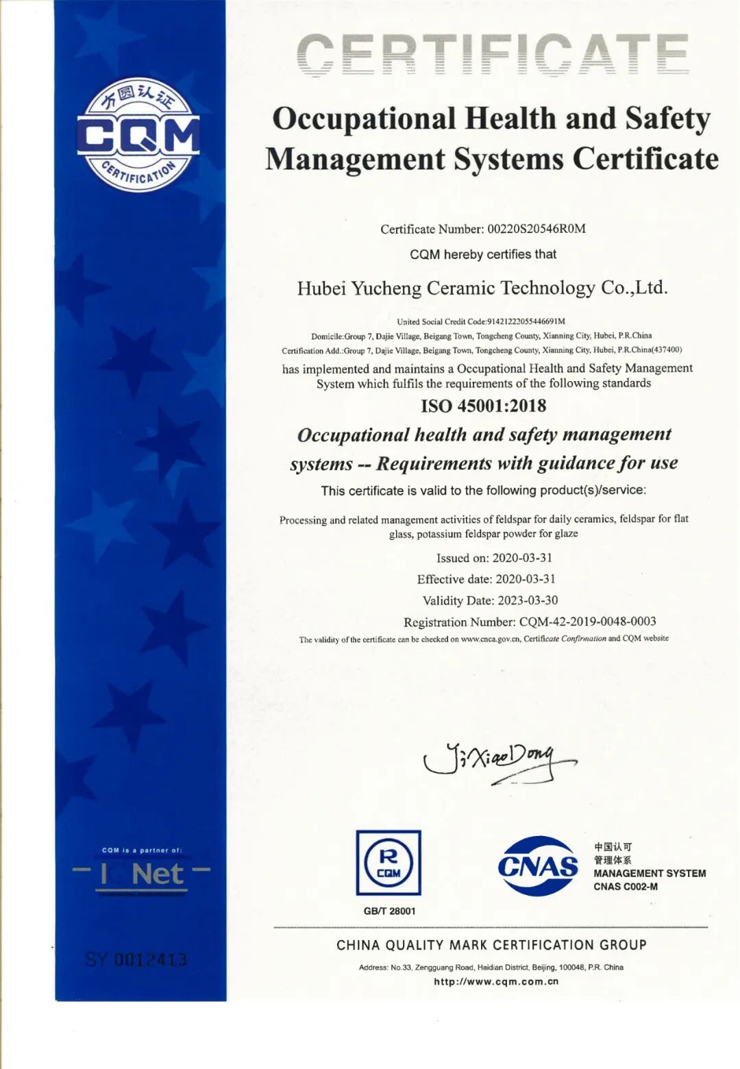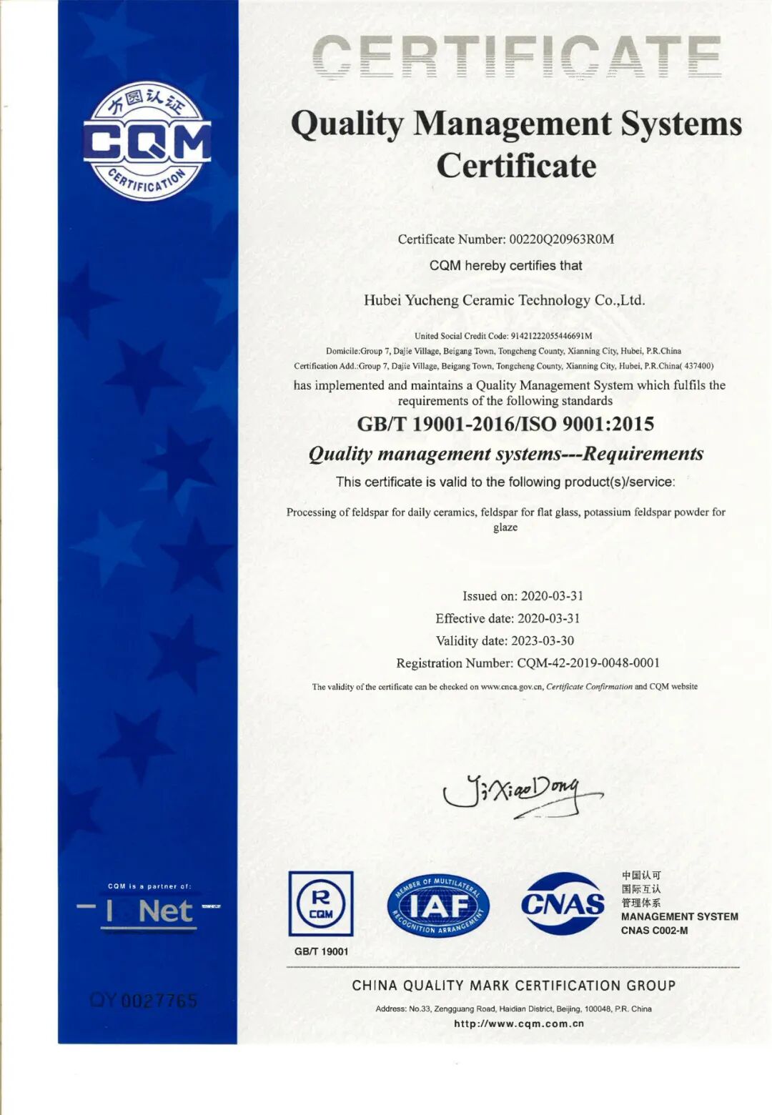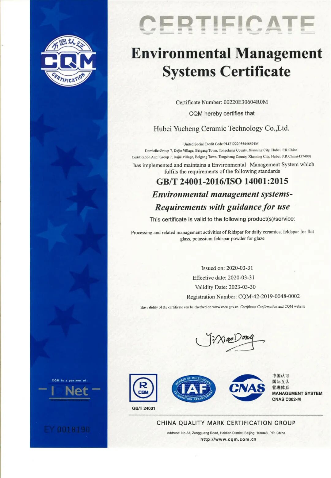 长期以来,以“守信用、重合同”作为企业立足的根本,以持续不断地研究只为研制出更好的产品理念为支撑,湖北玉成陶瓷有限公司在2020年斩获两项荣誉资质: